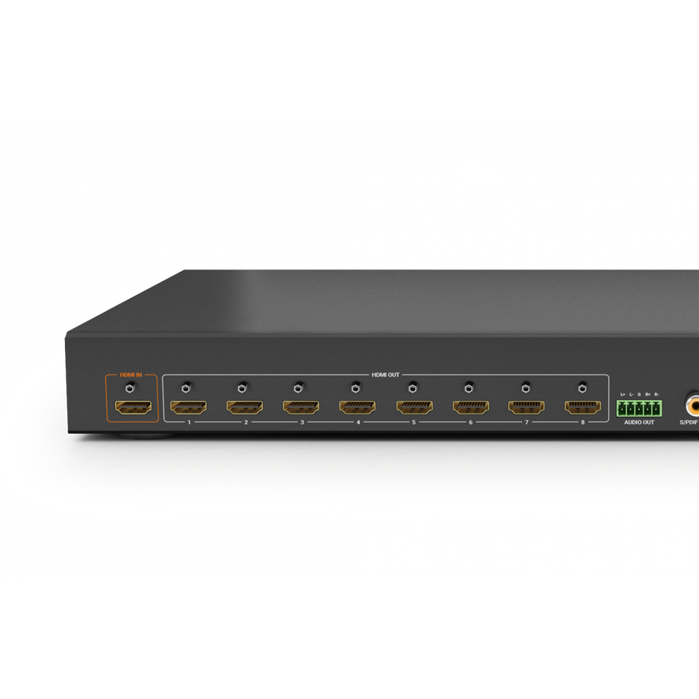 The SP-618 is a simple yet powerful HDMI splitter that can be used in many applications from digital signage to retail or hospitality. Each HDMI output of the SP-618 features a 4K to 1080p down scaler, allowing for mixed resolution displays to be used simultaneously without suffering from compatibility limitations. A balanced analog and digital S/PDIF audio de-embed allows easy connection for external amplifiers or DSPs. With a 1U chassis, the SP-618 can be easily fitted in standard 19” equipment racks for a tidy installation.