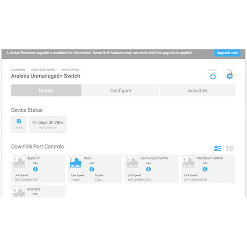 Unmanaged+ takes the reliability and cost-effectiveness of an unmanaged switch and adds basic cloud management via OvrC. Now you can see through the entire network to each connected device, making it easy to troubleshoot problems and adding a layer of visibility to an already great design
