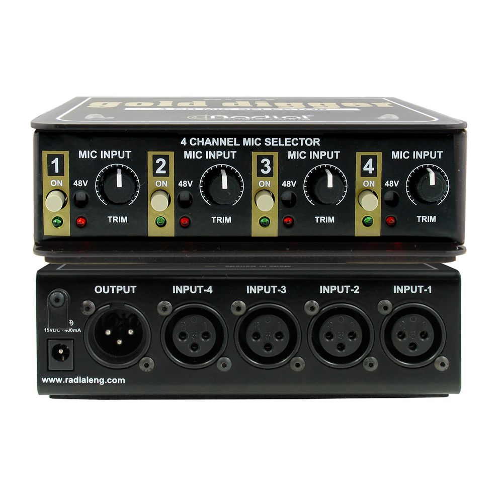 The Gold Digger allows you to record with confidence knowing that you've selected the right tool for the job each and every time you record. It provides the ability to instantly A/B between up to four microphones, without introducing any coloration, noise, or distortion. Individual set & forget trim controls let you adjust each mic level so that they produce the same relative output, and 48V phantom is available to power condenser microphones. The Gold Digger makes it easy to audition multiple options while maintaining studio efficiency and ensuring a smooth workflow. When paired with the Radial Cherry Picker™ you can choose between four microphones and four preamps in any combination, giving you the freedom to explore endless sonic possibilities.