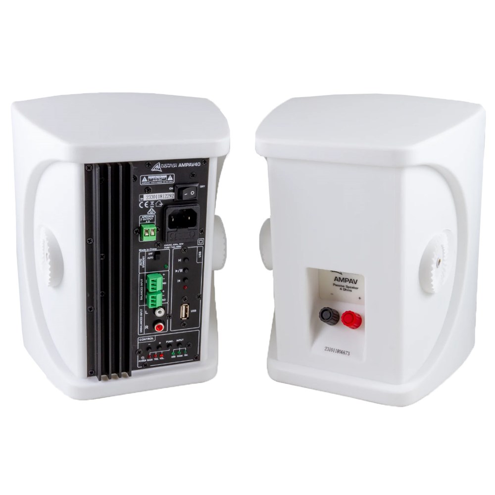 The Australian Monitor AMPAV40 is a self powered three-way stereo speaker system consisting of one powered and one passive speaker. The speakers are compact, architecturally pleasing and come supplied with adjustable mounting brackets.