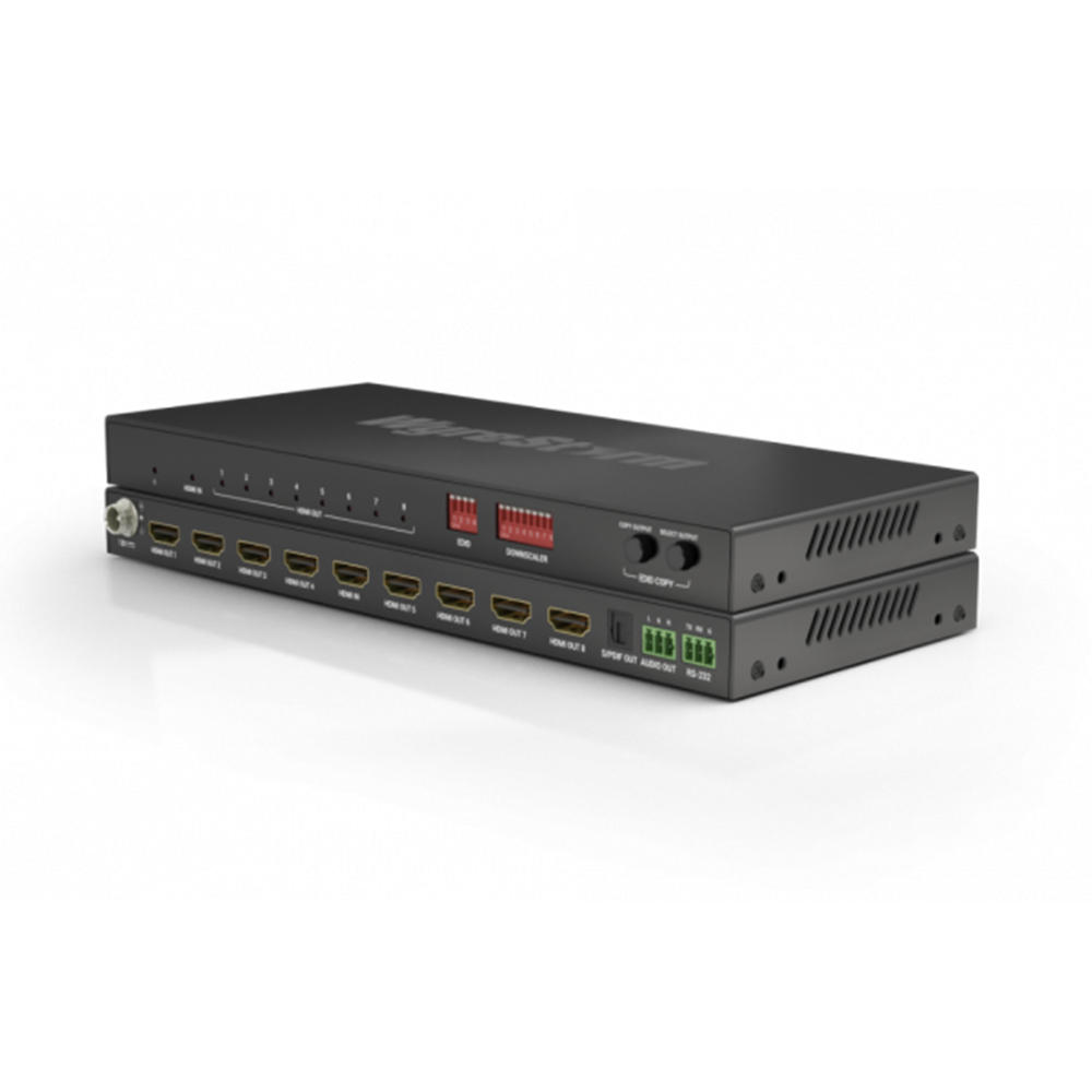 The SP-0108-SCL is a small and compact, yet powerful HDMI splitter that can be used in many applications, from digital signage, education, to retail or hospitality. Each HDMI output of the SP-0108-SCL features a 4K to 1080p down scaler, allowing for mixed resolution displays to be used simultaneously without suffering from compatibility limitations. An analog and digital S/PDIF audio de-embed allows easy connection for external amplifiers or DSPs.