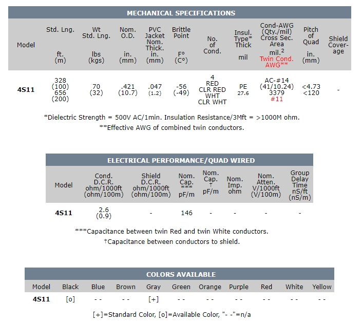 Recommended for long runs and low end Power Amplifier sub-woofer systems. Heavy duty 4 x 14 AWG conductors.
