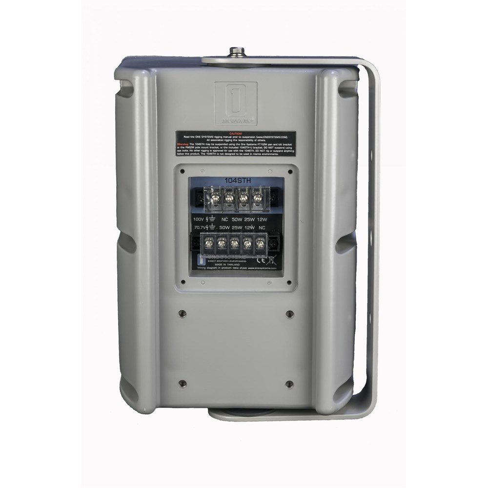 The One Systems 104/STH is a universal direct weather loudspeaker system designed for use in general purpose inland environments. The 104/STH utilizes stainless steel for all rigging points that are to be used in conjunction with optional One Systems rigging accessories, such as the PM2/M pole mount system, or PT-10/M pan/tilt bracket. The included U-Bracket and grille are both made from a structural steel coating with a highly durable dual layer zinc rich powder coating.