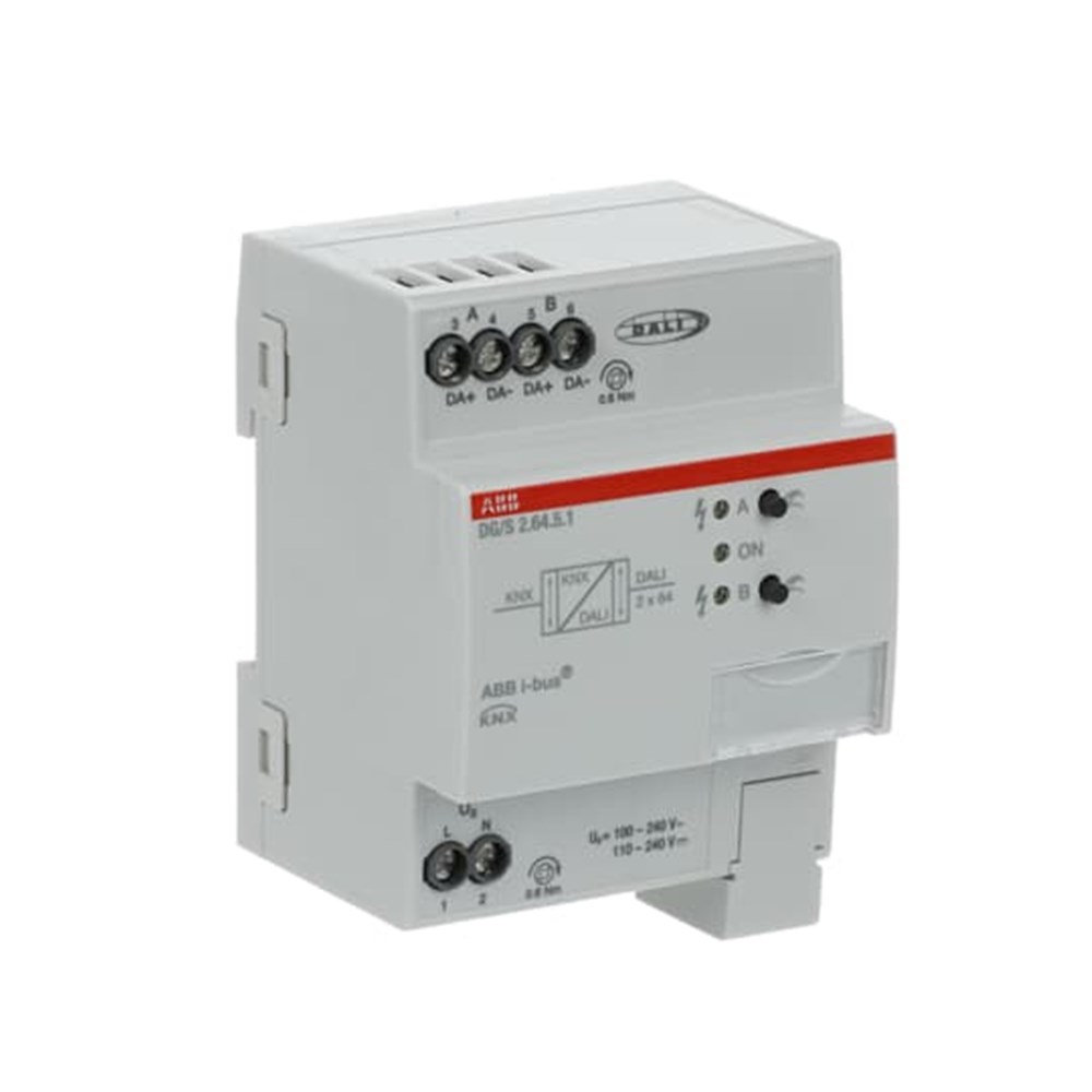 Single-Master DALI Controller certificated acc. to DALI-2 (EN 62386). The device is used to control DALI or DALI-2 devices via ABB i-bus® KNX. Two DALI outputs for up to 2x64 DALI participants. DALI power supply is integrated. Control and status feedback is carried out via KNX per DALI participants (2x64), with lighting groups (2x16), together in broadcast or per scenes (2x16). DALI devices type DT1 (Self-contained emergency converter acc. EN 62386-202) and type DT8 (colour temperature Tc & RGB(W) acc. EN 62386-209) will be supported. Other DALI devices e.g., DT6 can be controlled via standard DALI commands acc. to EN 62386-102.