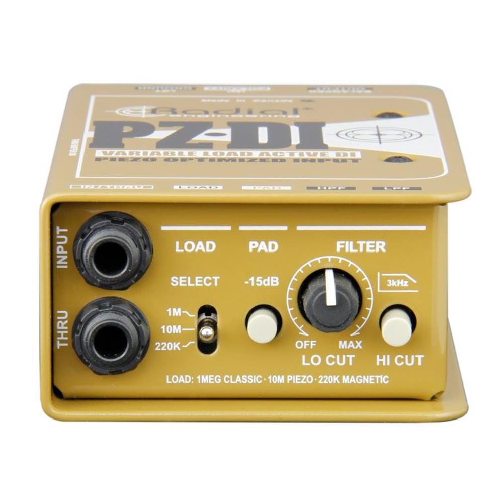 The PZ-DI is a high-performance specialized active direct box designed to accommodate acoustic and orchestral instruments, with a selectable input impedance that can accommodate magnetic pickups or piezo transducers, and a variable low-cut filter.