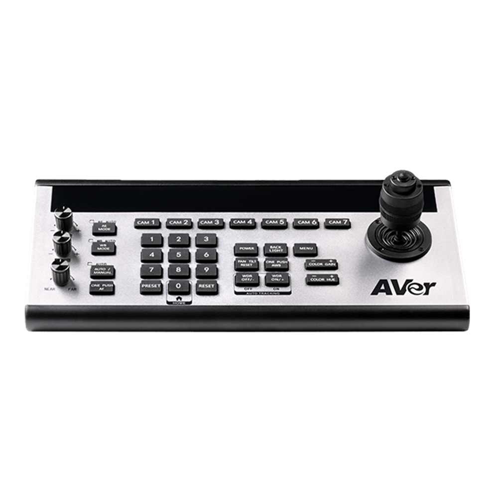 The AVer CL01 is a professional PTZ camera controller with a robust communication interface, built-in VISCA and Pelco-D/P protocols. It supports RS-422 / RS-485 / RS-232 / IP control for compatibility with most PTZ cameras. Simple configuration makes it easy to operate the 7 camera shortcut channels, 3 infinite rotation knobs, and more.