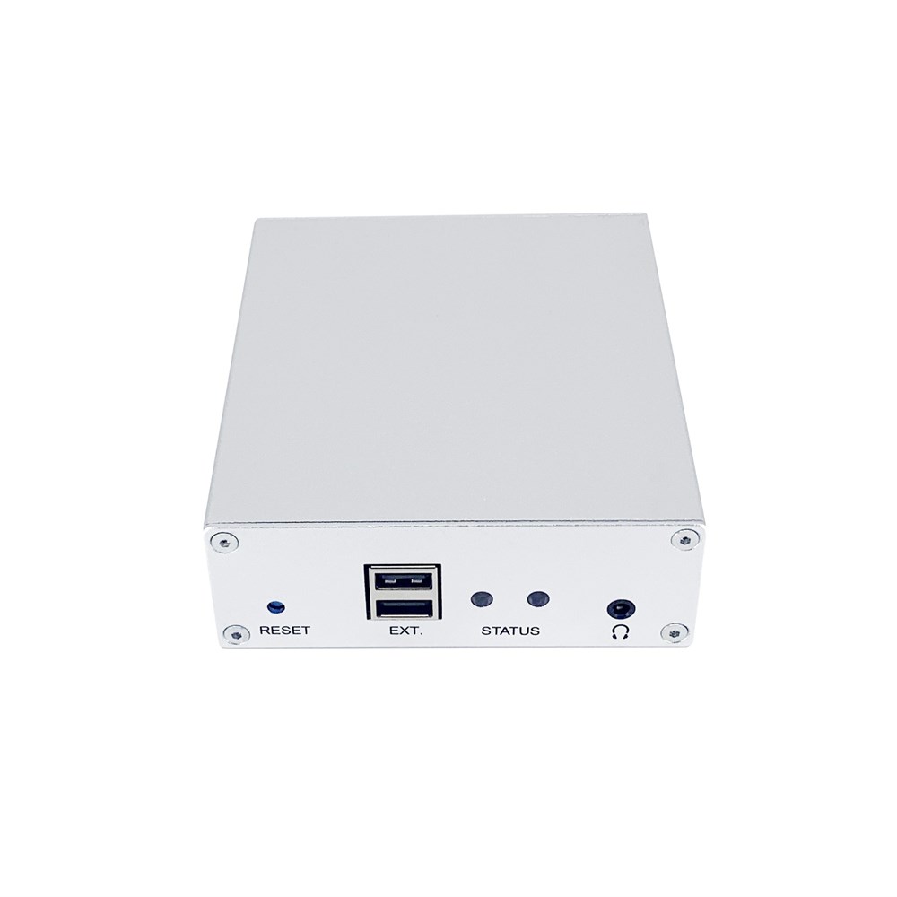 IP Audio Decoder and Amplifier with up to 40W RMS @ 4Ohm Speaker OutputThe Exstreamer MPA400 feeds 2 – 8 Ohm Speakers and turns them into an extensive Audio over IP system. Syn-Apps are supported. The codec supports PCM, AACplus, MP3, OPUS, G.711, G.722 that can be served over HTTP and RTP protocols. Audio files can be stored on the internal memory and their playback can be triggered via a simple UDP command. The MPA400 is a solid metal device, easily installed. All PoE standards are supported (up to 4PPoE) to feed the built-in 40W full digital class-D audio amplifier meeting different speaker requirements.If PoE is not an option, an external power supply can be deployed too. The device offers a modern and user-friendly web interface for its configuration. REST API to interface with third party applications is also available.