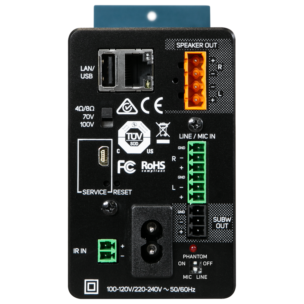 The Bluesound Professional B170S networked streaming stereo amplifier is a complete solution for a commercial music installation. The B170S combines a high-quality stereo low impedance and constant voltage amplifier with a BluOS enabled network music player. The B170S’s amplifier section provides 2 x 80W of power into 4/8Ω or 2 x 100W at 70V or 1 x 100W at 100V. This provides plenty of power for most small/medium spaces and thermostatic fan cooling provides for reliable operation in commercial environments. The amplifier technology is highly energy efficient and also has a standby mode consuming only 6W of power. The addition of constant voltage outpu ts allows for long chains of small speakers to be powered with variable power tapping at each speaker giving control of local volume.