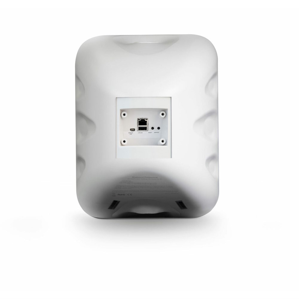 The Bluesound Professional BSP1000 is a network active loudspeaker with integrated streaming capability designed specifically for use in either indoor or outdoor commercial installations. This unit is powered by Power over Ethernet(PoE) allowing a one-wire connection to the speaker for both power and audio. The player in the BSP1000 is based on the established BluOS platform and is capable of playing and distributing content from local network storage as well as from a large number of streaming services, including some specifically designed for commercial use, such as SoundMachine, Custom Channels, QSIC, SiriusXM Music for Business, Tunify and radio stations. As well as stand-alone use, it is possible to use a pair of BSP1000 speakers in stereo configuration and multiple BSP1000’s in a room in either mono or stereo configurations. Use of the BSP1000 in a larger BluOS system is also possible, allowing for grouping into user-definable groups of whatever size is required with other BSP1000 units and/or any other connected Bluesound Professional players, amplified players or network speakers on the network in an installation.
