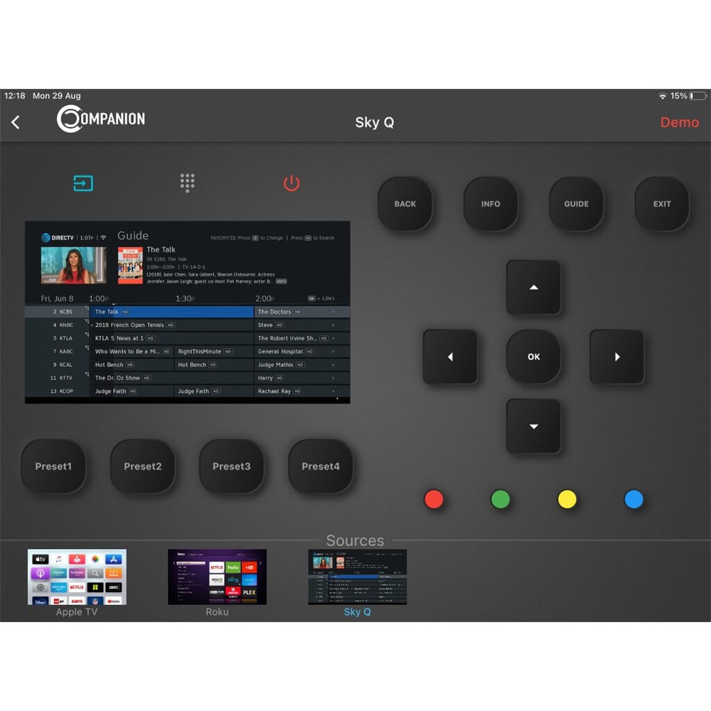 License for 6 TablesCompanion Control provides additional capability to a NetworkHD system by working seamlessly with NetworkHD hardware and the NetworkHD Touch app.Companion adds the ability to control source devices by leveraging already existing hardware and the NetworkHD API. The app offers an incredibly quick and intuitive experience driven by a wizard-guided setup. Preloaded control commands for the industry’s most common source devices such as DirecTV, SKY, Apple TV, Roku and more are available with a modern user interface that is built automatically.