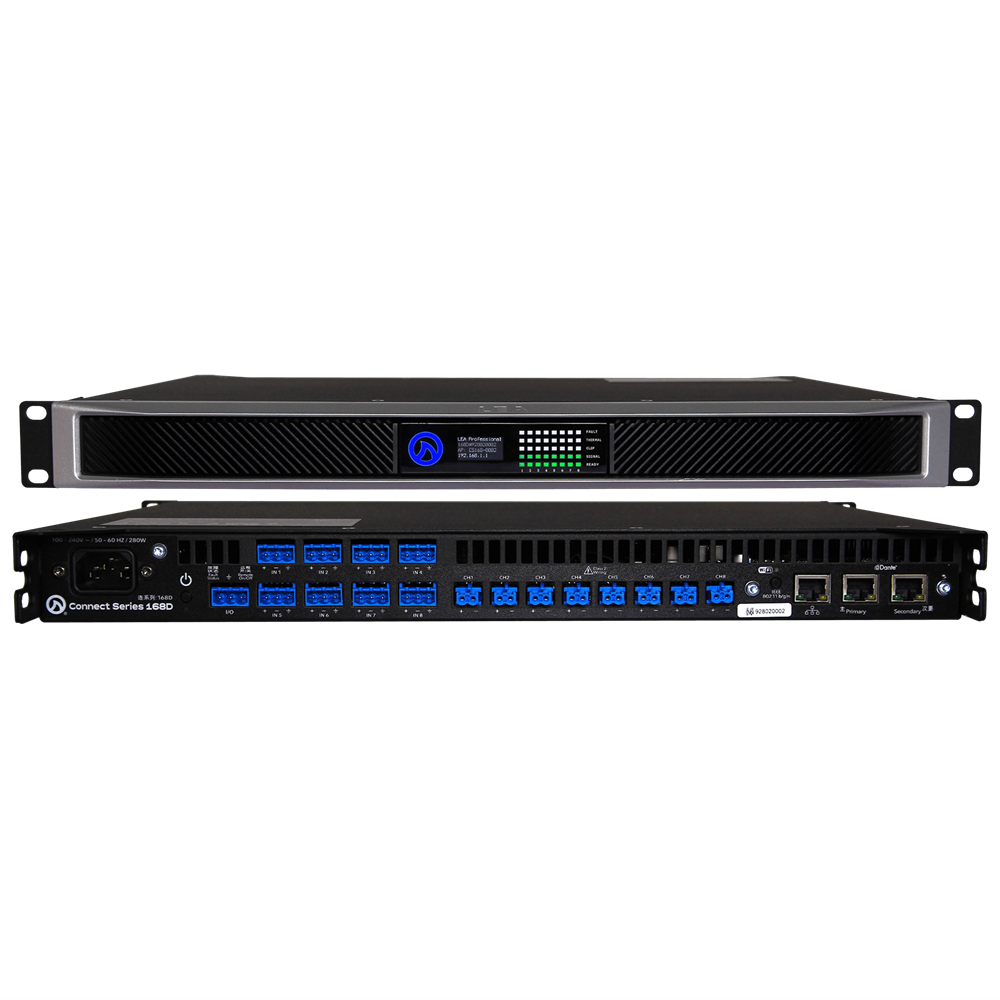 SMART AMP WITH DANTE | 8 CH | 160 WATTS PER CHThe CONNECTSERIES 168D is an 8-channel amplifier with 160 watts per channel. As part of the Dante CONNECTSERIES, the world’s first Internet of Things- (IoT) enabled professional-grade amplifiers, it is perfectly suited for small to medium-scale installations. The 168D features direct HiZ (70V or 100V) or LoZ selectable by channel. With three ways to connect, you can engage the built-in Wi-Fi access point, connect to the venue’s Wi-Fi, or use the FAST Ethernet to connect to any local area network via Cat5 or Cat6 cable.