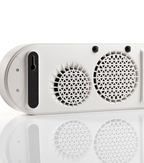 Both the casing and the front baffle of the KATCH ONE are moulded from a glass fibre reinforced ABS compound. This material enables us to construct a platform for the drivers that optimises the flow of air, widens the stereo image, and guides the sound towards the listener. This forms the base for an extremely rigid structure that ensures that the movement of the drivers does not cause unwanted resonances in the cabinet structure that could result in distortion of the audio signal.All of the available inputs and outputs are placed on the rear of the cabinet in a connection bay that hides the plugs from view, and gives easy access to the cable management system along the top back of the KATCH ONE. It is possible to have the connected cables run either up or down from the connection bay, depending on the type of placement chosen.Both the fixed grille on the rear of the KATCH ONE and the front baffle have built-in air-flow guides to optimise the spread of the audio signal. With woofers placed both on the front and the back of the unit, directing and optimising the flow of air becomes very important. The rear woofers are designed to integrate with the wall to expand the bass performance, also utilising the wall to widen the stereo image. In the same way, the front woofers are placed on the front baffle surrounded by a wave guide that helps control and aid the air flow for optimised dispersion.