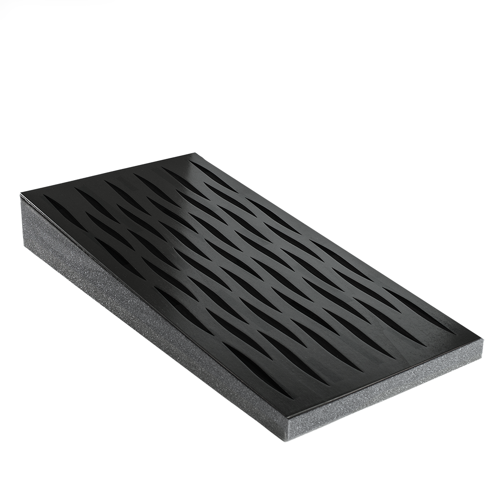 Decosorber Natur absorbers are specially designed for mid frequency absorption. They are made from highest quality polyester foam (USAP*), coated with a black velvet layer and covered with a 4mm Poplar plywood plate which is available in different designs and colors with a semi gloss finish. Because of the natural wood and its grains, every panel is unique in its look, giving your space a warm ambience.