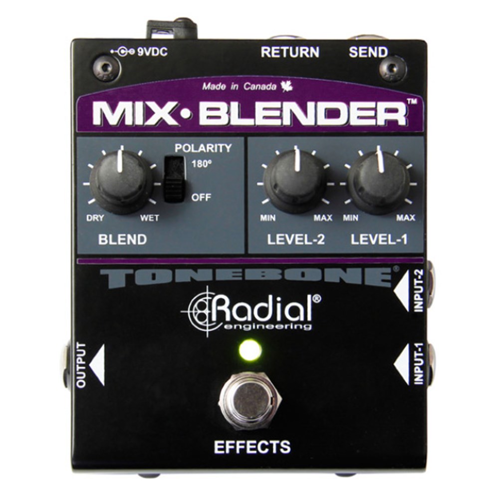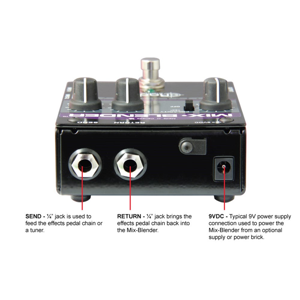 The Mix-Blender™ is a multi-function pedal that lets you mix two instruments or pedals together and then send the signal through a footswitch-controlled effects loop for processing.