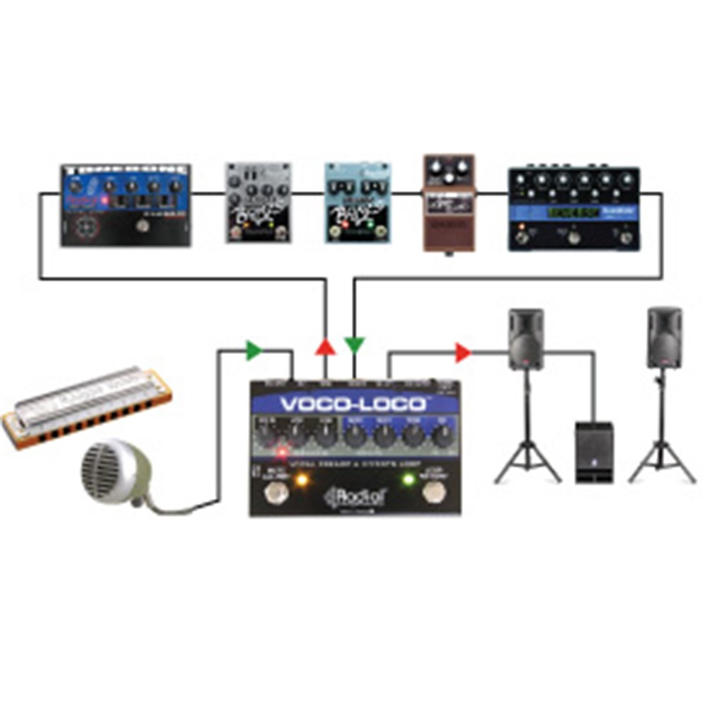 The Voco-Loco is a foot-controlled microphone preamp and effects loop switcher that enables a vocalist or acoustic instrumentalist to incorporate guitar effects pedals into their signal path.