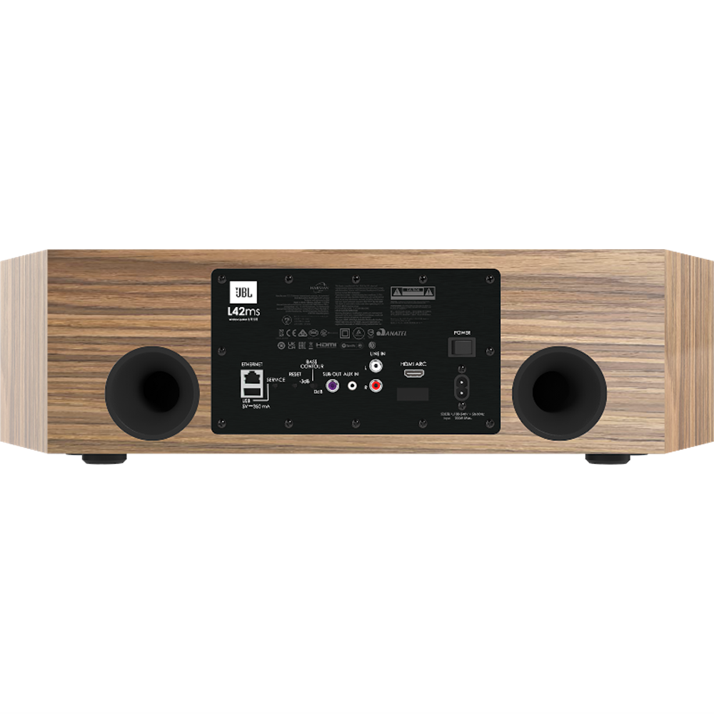 The JBL L42ms is an Integrated Music System that was designed to fit today’s entertainment lifestyle by showcasing the iconic sound of a pair of JBL loudspeakers in a single cabinet system. Behind the iconic JBL Quadrex grille are a pair of dual 4-inch (100mm) woofers and dual 0.75-inch (20mm) Aluminum dome tweeters with waveguides positioned to the left and right to create a wide and even sound-field. On the outside, the L42ms comes with a stylish curved grille, tapered side edges, and is available in the classic JBL real wood veneer finishes of Black Walnut or Natural Walnut.