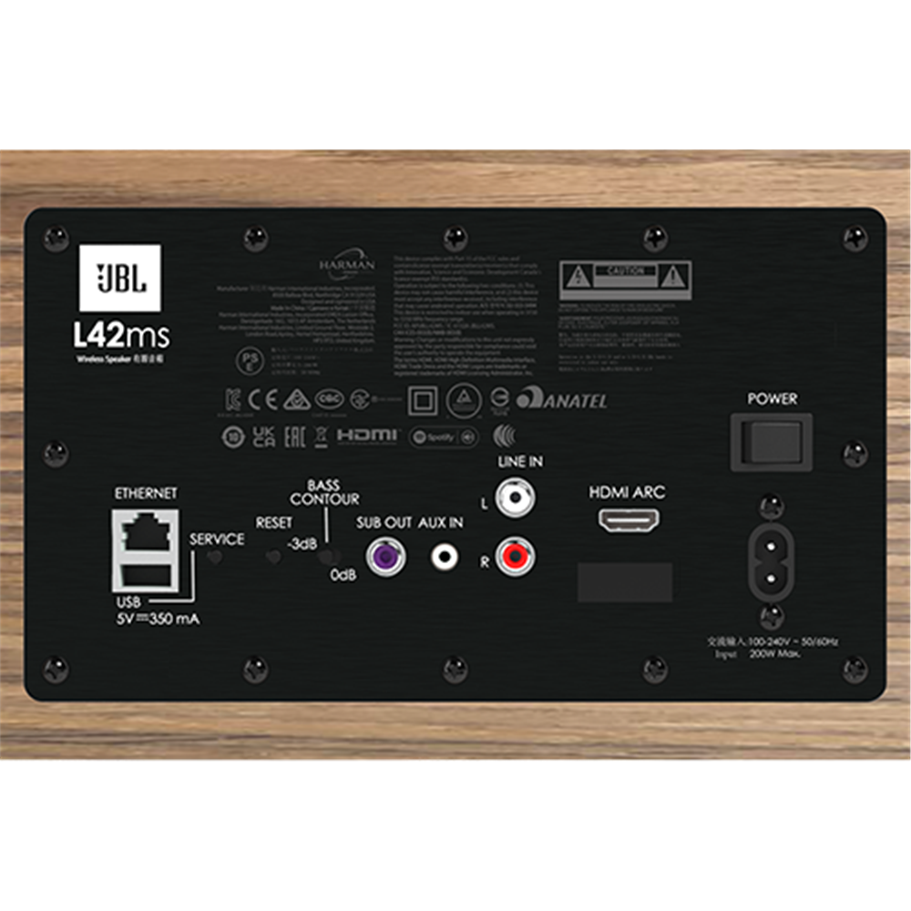 Audio connections include two sets of analog stereo inputs (one pair RCA style and one 3.5mm input) along with one HDMI-ARC for connection to a TV with similar connection for audio signal and control. Additionally, the L42ms can play streamed content via a wired or wireless network connection via Spotify Connect, Apple Airplay2™, and Google Chromecast or connect to a device directly via Bluetooth. All audio signals are routed through an advanced DSP engine where the content is carefully contoured and output to the speakers via a four-channel amplifier delivering 75W RMS to each woofer and 25W RMS to each tweeter. The total system’s 200W RMS amplifier power can be controlled via a touch panel located on the cabinet top panel, included Bluetooth remote, or from one of many music or automation apps. Designed and Engineered at the Harman Center of Acoustics Excellence in Northridge, California, the L42ms leverages JBL’s past 75+ years of loudspeaker and electronic designs to deliver truly outstanding sound and convenience while outperforming most traditional component hi-fi systems in the process. With its incredible combination of style, size, and performance, there is simply nothing like the L42ms Music System.