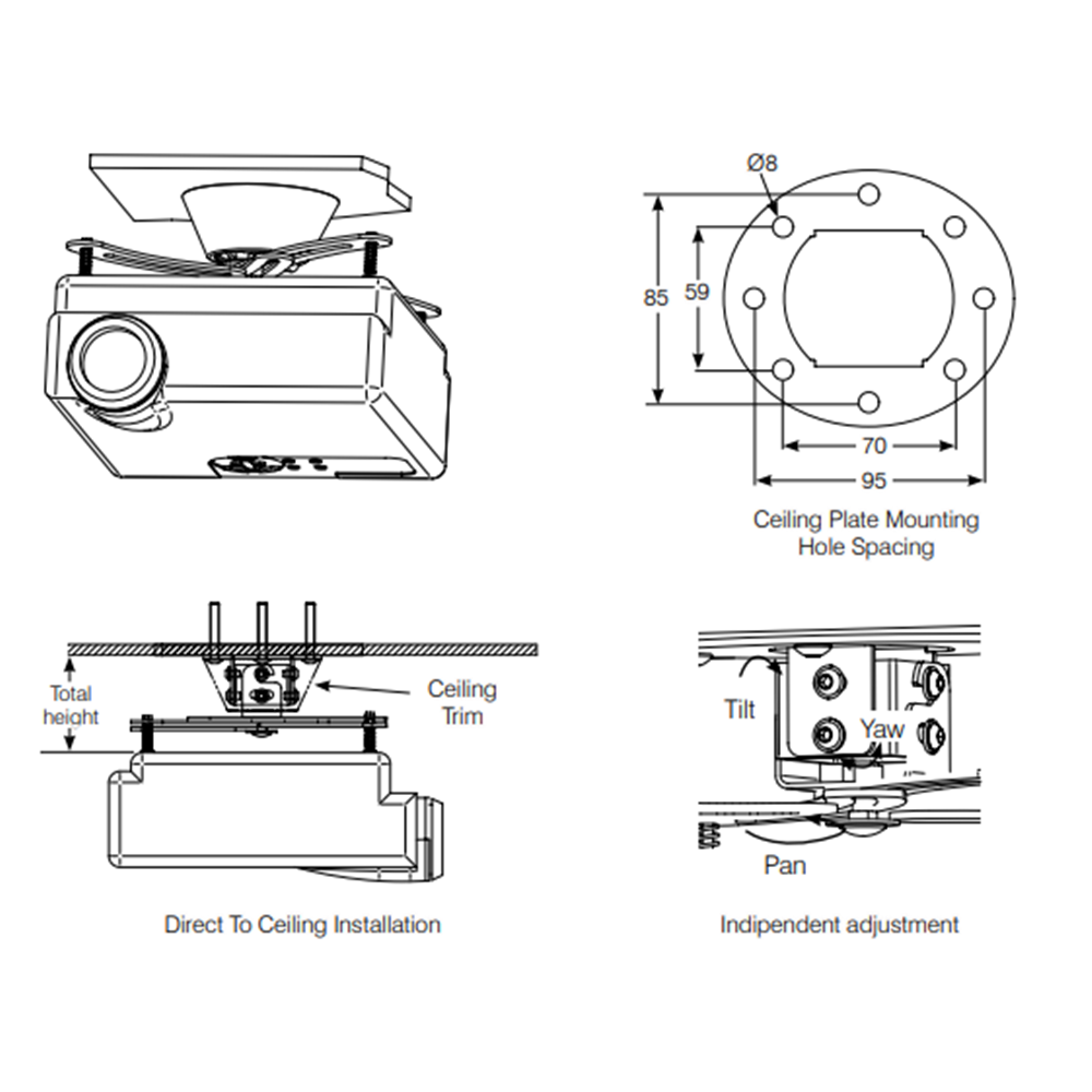 • Independently lockable Yaw, Tilt and Pan adjustments.