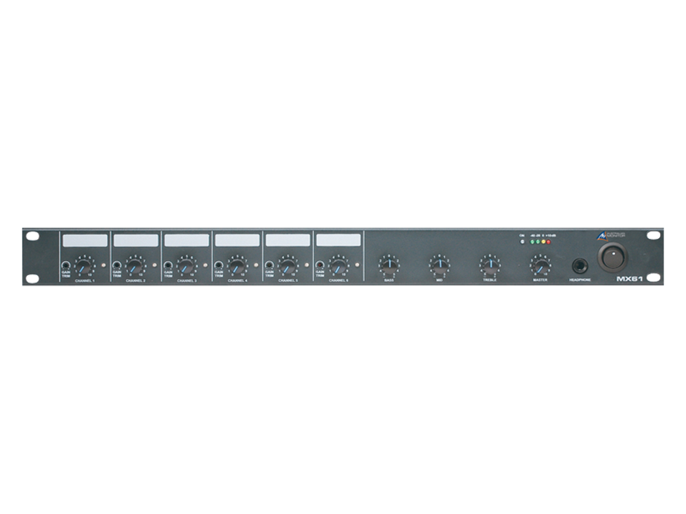 The MX61 Mixer brings a range of new features to the AMIS standard 1 RU mixer range. The MX61 mixer features the new Australian Monitor Standard (AMS) input section which has an XLR input switchable between microphone and line level, dual RCA line inputs, signal present LED indication, individually switchable phantom power, and +/- 15dB of gain trim available per input.