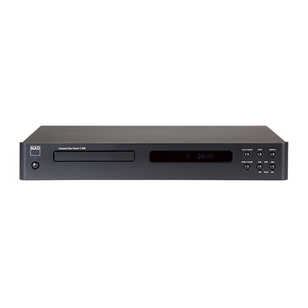 The NAD C 538 includes many desirable features that enhance listening pleasure. Front panel controls are duplicated on the hand held remote allowing Play, Pause, Skip, and Scan functions. In addition, many more features are available from the remote handset, such as RANDOM: Tracks/files are played at random mode, PROGRAM: Enter or exit program mode, REPEAT: Track, file, folder or whole disc is repeated, RPT A-B: Playback sequence is repeated. The dimmable dot matrix display shows tracks, total playing time. Track time, disc time, and remaining time are all available. The C 538 also can play CD-R/CD-RW discs allowing you to burn songs from your computer for playback on your CD Playing system.