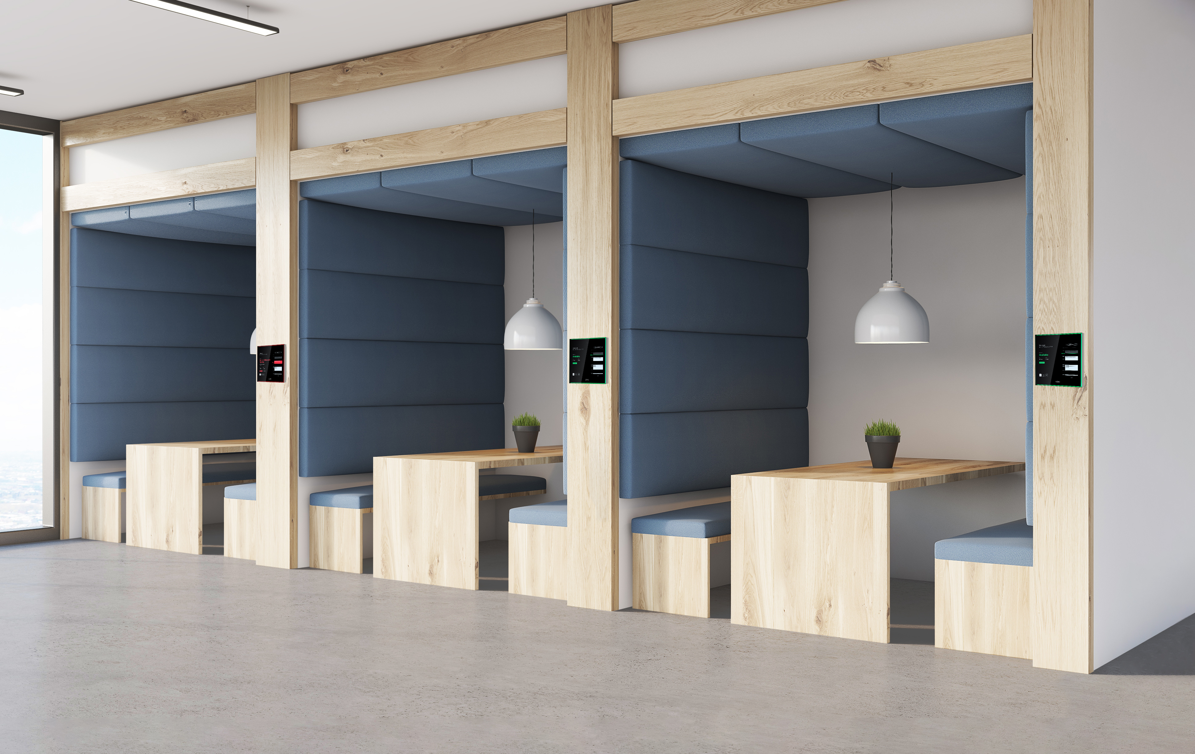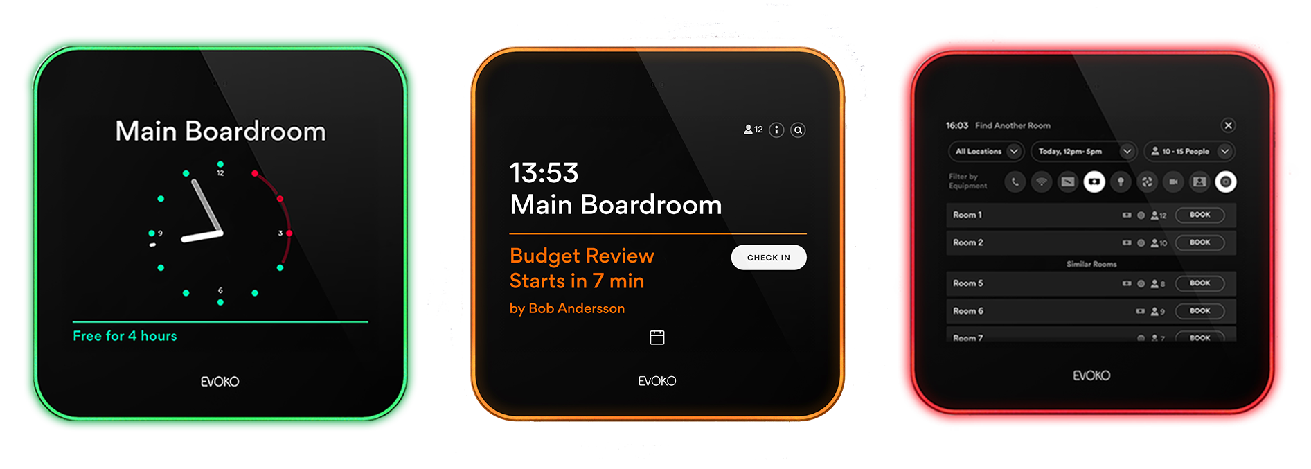 Evoko Liso is a touch-screen room booking tablet for installation outside meeting rooms. In partnership with the (included) Evoko Home software application (installed on a user-provided Windows or Linux server), Evoko Liso shares information with the digital calendar capabilities of Microsoft Office, Google Workspace and other compatible software suites. Room status is indicated by a subtle coloured light ‘aura’ surrounding the tablet, which allows users to easily find their way to a booked meeting or to identify an available room. On approach, the summary display will switch to a detailed view showing room bookings and availability and allowing users to easily create an ad hoc booking.