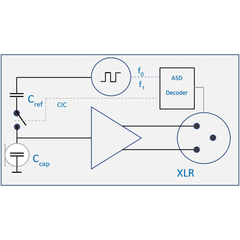 The test signal is capacitively coupled to the input of the MA230 preamplifier and attenuated by the capacitance of the microphone capsule. Before starting the measurement series, the reference spectral levels are recorded so that later measurements can be compared with this reference. If a capsule is damaged, its capacitance changes, which consequently leads to a change in the microphone signal level. This signal now passes through the preamplifier, the connecting cable and the input stage of the measurement instrument, where it is digitized and evaluated.