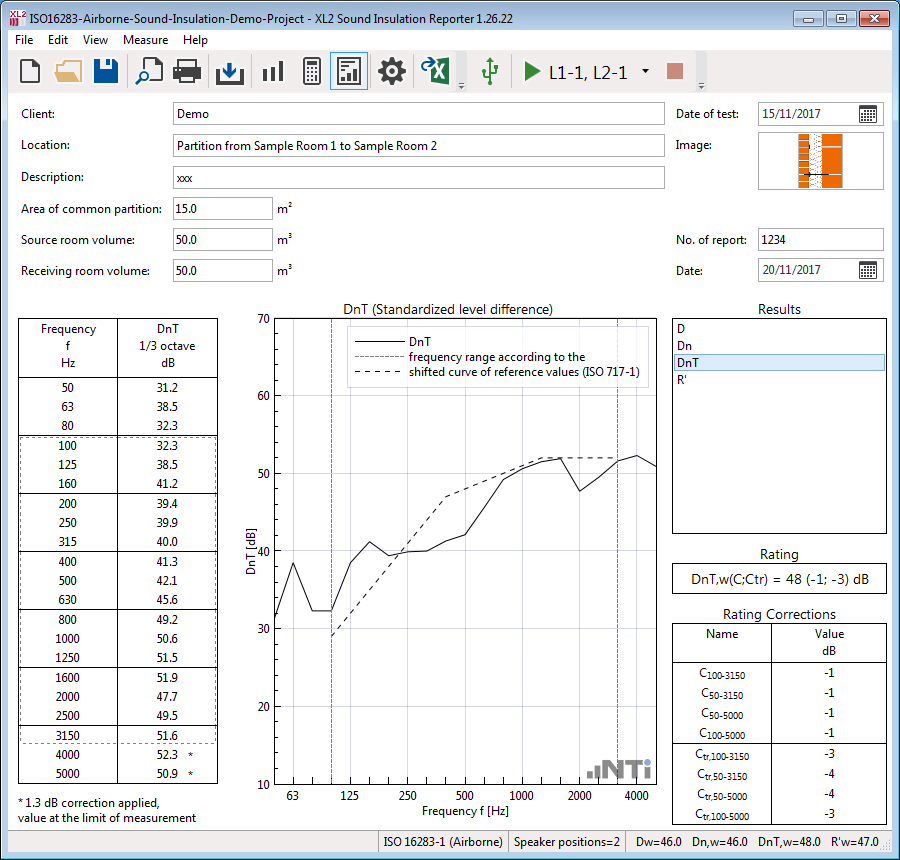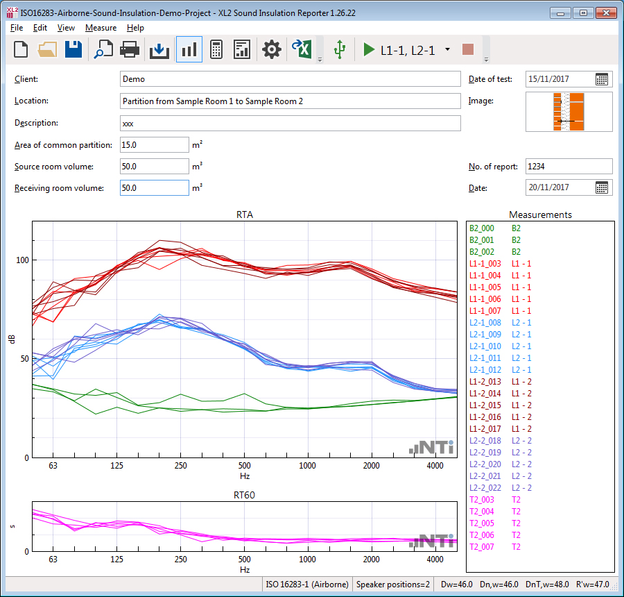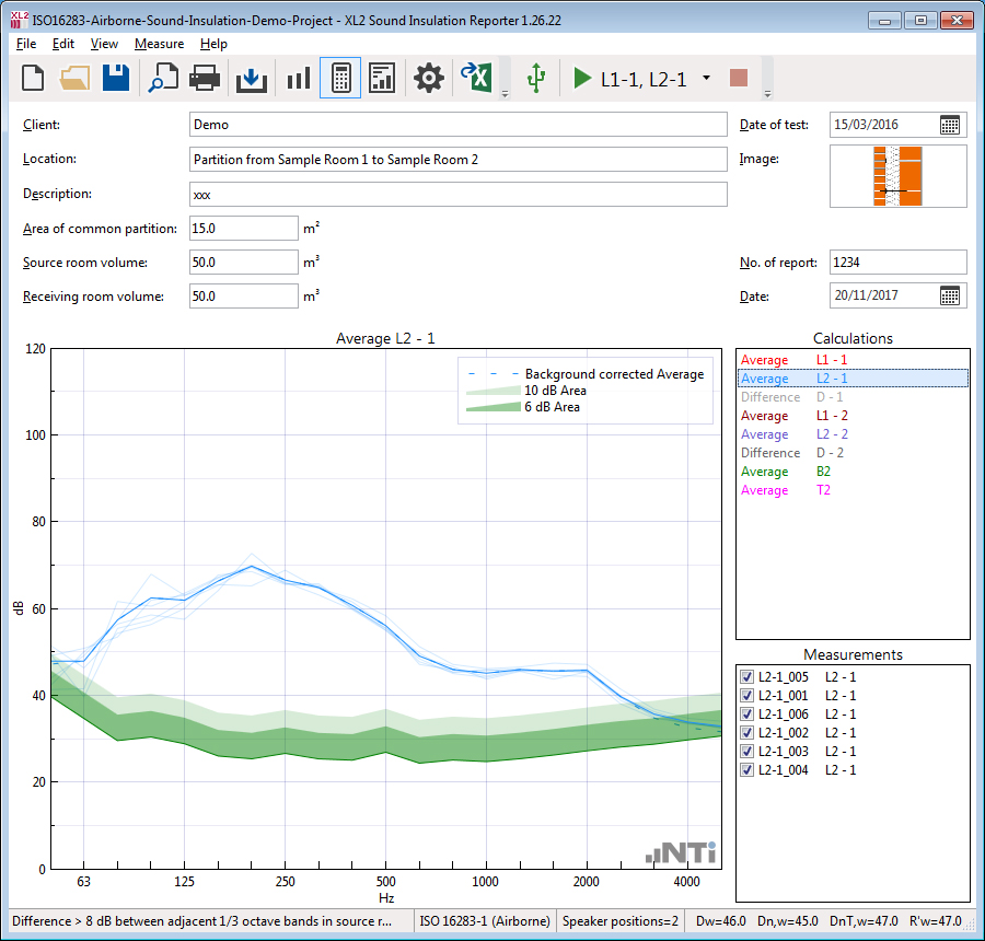 The Sound Insulation Reporter software offers remote measurements; two or more XL2 Sound Level Meters may be controlled directly by the software connected via USB or wireless. This offers parallel measurements of sending and receiving room onsite, thus a great time saving.The Sound Insulation Option enables the import of measurement data into the Sound Insulation Reporter software. Utilizing the remote sound insulation measurement functionality requires an activated Remote Measurement Option on the connected XL2s.Features of the Sound Insulation Reporter software: