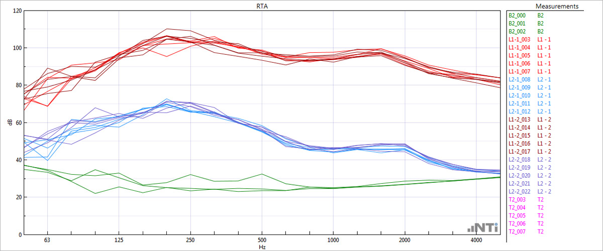 Evaluate the individual data sets for each room and speaker position. The colored background noise correction areas provide the important information at a glance.