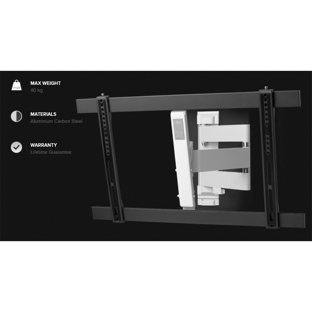 The dual arm construction allows a uniquely high maximum wall distance of 60cm. The minimum wall distance of 3.5cm is just as impressive. Total freedom in positioning your TV!Anti-scratch PaddingThe arms that your TV is attached to featrue soft padding to protect the tv while connectedCable ManagementCable management is integrated in this tv bracket, ensuring tidy organisation of your cables.Ideal for corners & Adjoining roomsThe dual-arm technology makes this bracket the ideal solution for mounting your tv in a corner or to watch tv from an adjoining room.Easy leveling after installationThe level of the bracket can easily be adjusted after installation. You can always be sure your TV is straight.Spirit level includedTo ensure your TV hangs evenly, a spirit level is included inside the box.
