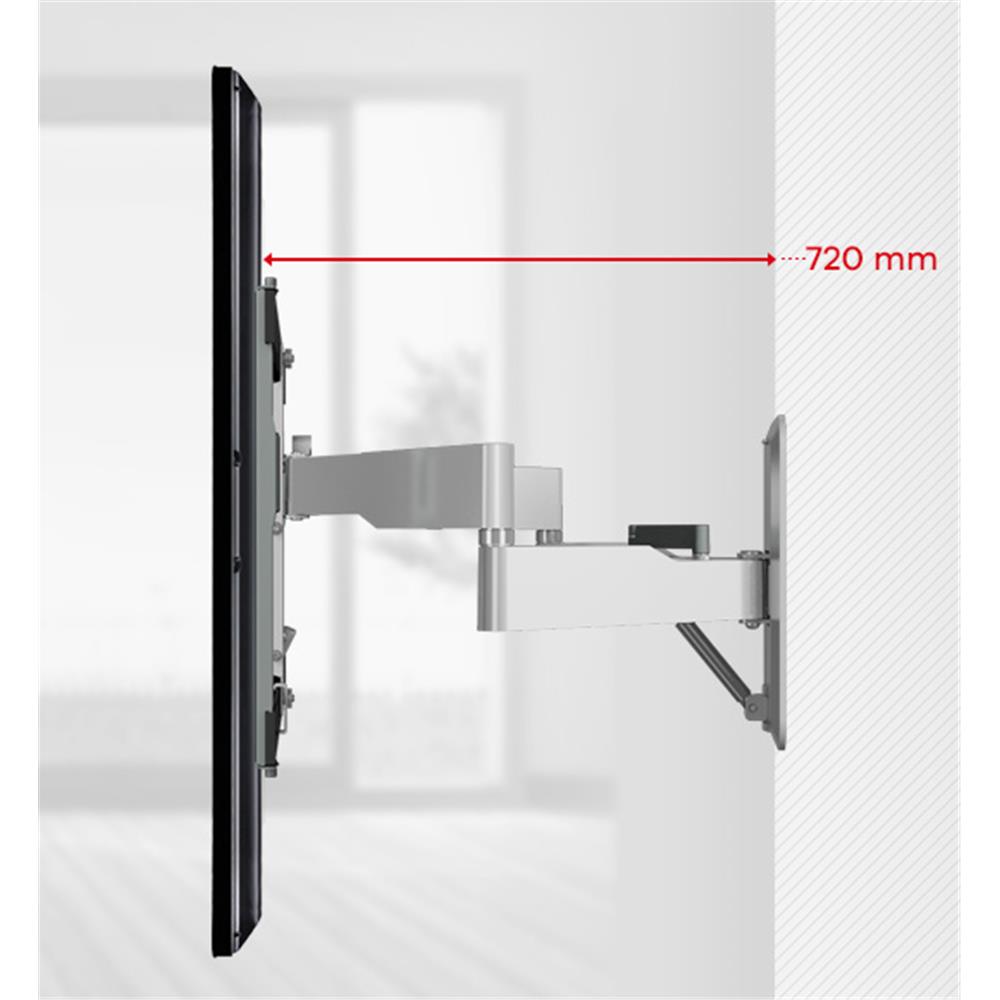 The dual arm construction allows a uniquely high maximum wall distance of 72cm. The minimum wall distance of 7cm is just as impressive. Total freedom in positioning your TV!