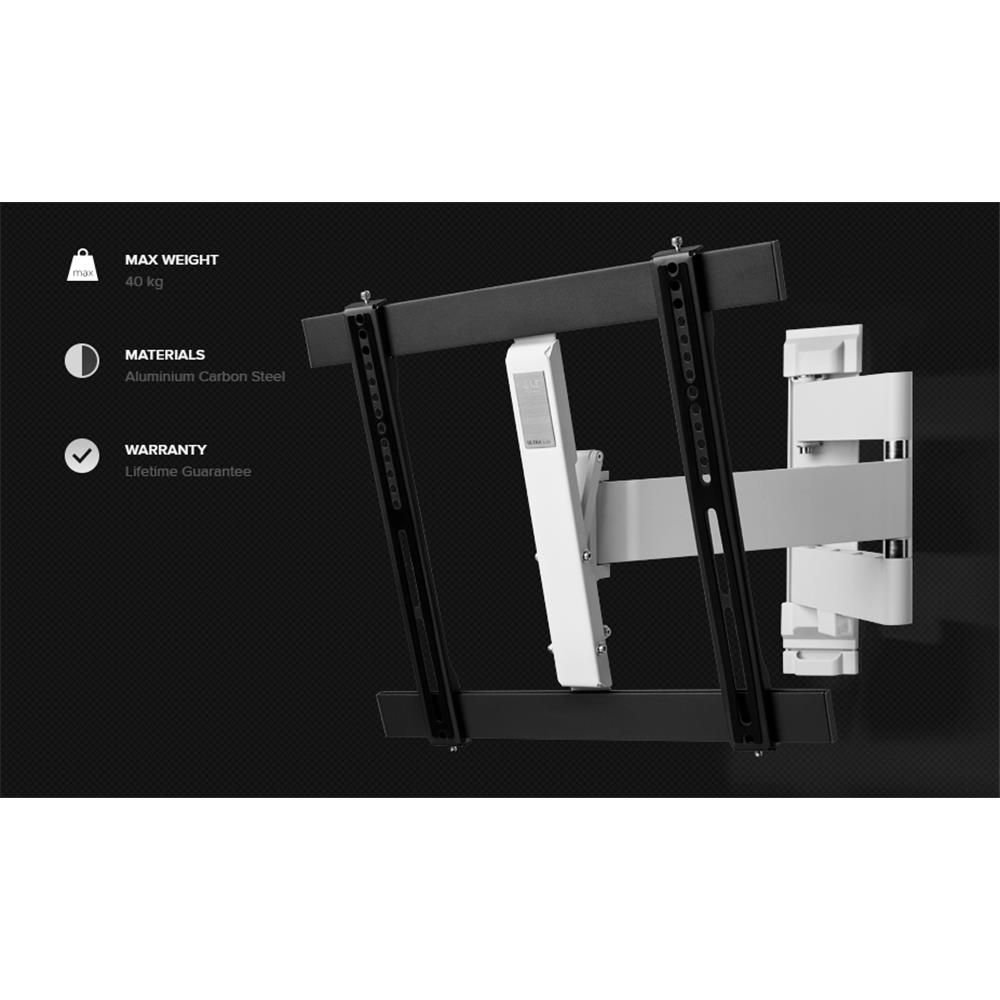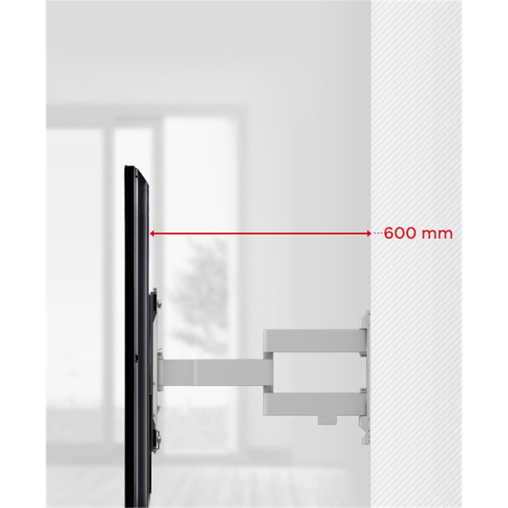 The dual arm construction allows a uniquely high maximum wall distance of 60cm. The minimum wall distance of 3.5cm is just as impressive. Total freedom in positioning your TV!Ultra Slim designUnobtrusive design, smart engineering and high quality, durable materials. Complete with a worry-free lifetime guarantee.Anti-scratch PaddingThe arms that your TV are attached to feature soft padding to protect the TV while connectedCable ManagementCable management is integrated in this tv bracket, ensuring tidy organisation of your cables.Ideal for corners & Adjoining roomsThe dual-arm technology makes this bracket the ideal solution for mounting your tv in a corner or to watch tv from an adjoining room.Easy leveling after installationThe level of the bracket can easily be adjusted after installation. You can always be sure your TV is straight.Spirit level includedTo ensure your TV hangs evenly, a spirit level is included inside the box.