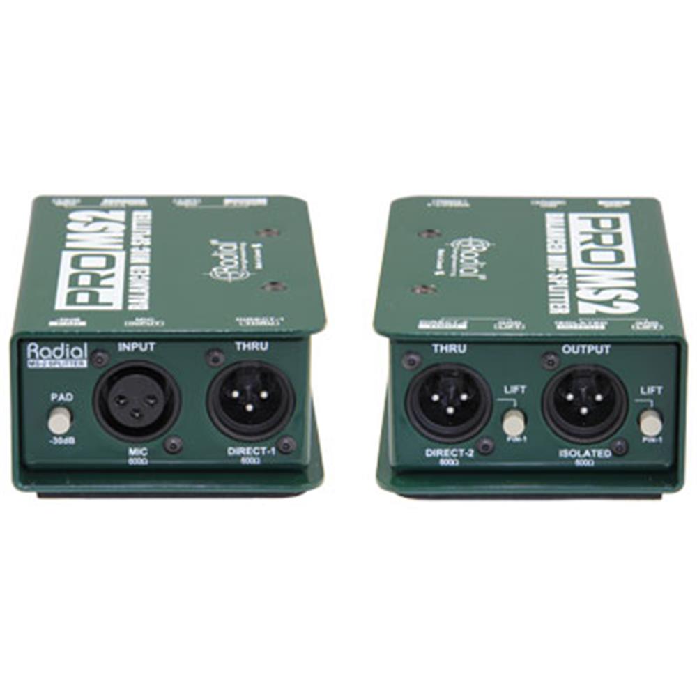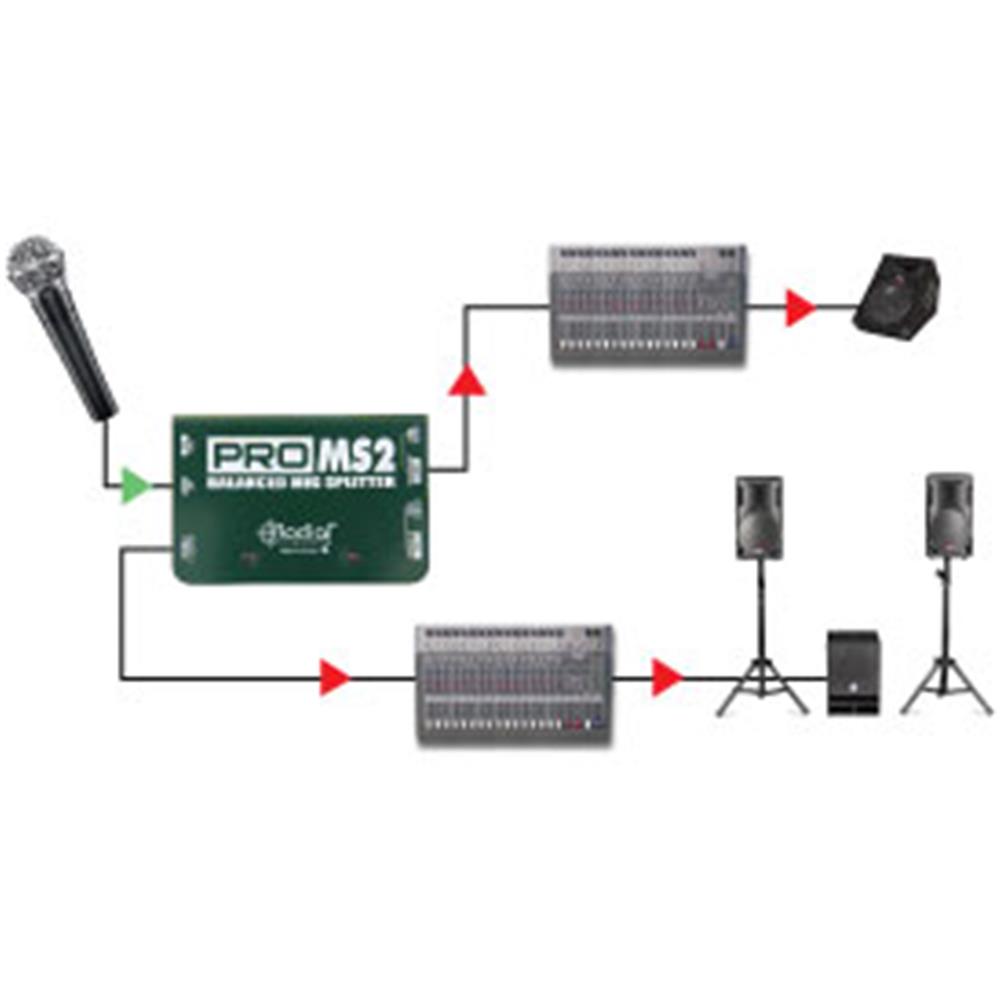 The Radial ProMS2 is the perfect interface for splitting a microphone to feed more than one mixer at the same time. 100% isolation eliminates potential ground loops between the two consoles for quiet performance while the main output provides a 48V phantom power return path to the mic.