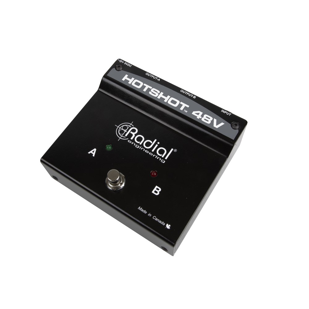 The HotShot 48V is a condenser microphone switcher built for silent operation on stage, allowing an artist to power their vocal mic and reroute it to feed the stage monitoring system for communicating with other band members or technicians at the press of a footswitch. LED indicators display the active output, and the footswitch itself can be configured for latching or momentary action. While the HotShot 48V is specifically designed to address issues when switching condenser microphone outputs, it works equally well with dynamic mics also.