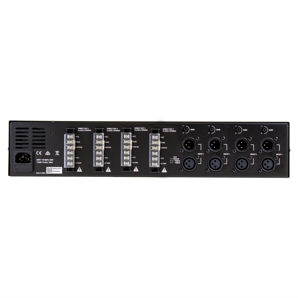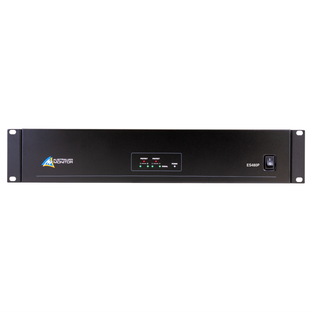 The ES480P power amplifier delivers 80 watts per channel at 100 volt or 4 ohm in a 2 RU package.