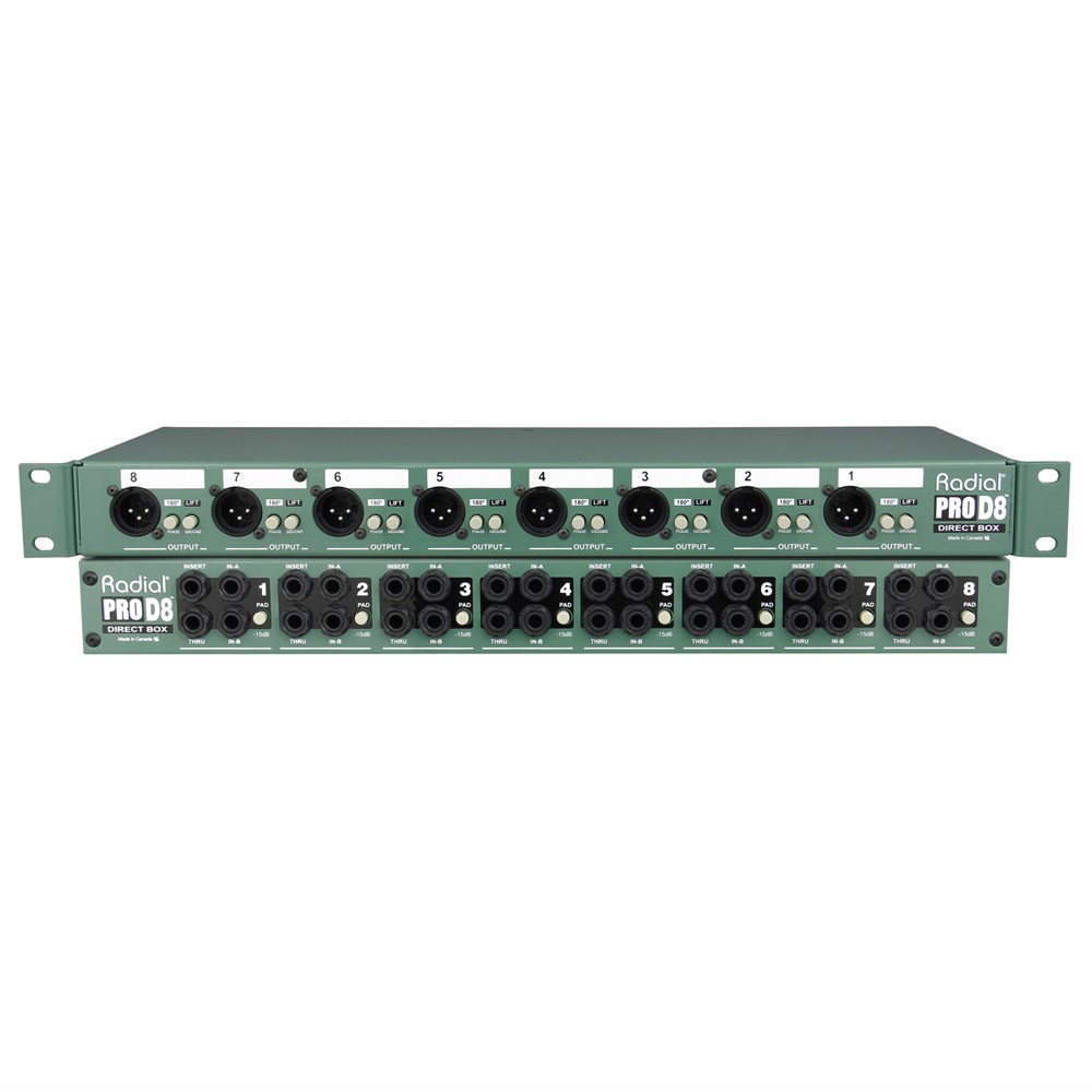 To enhance setup options, the Radial ProD8 is equipped with reversible rack ears. This handy feature allows the system tech to position the inputs on the front of the rack when interfacing with external keyboards or have them inside if the setup is predominantly equipped with rack modules.