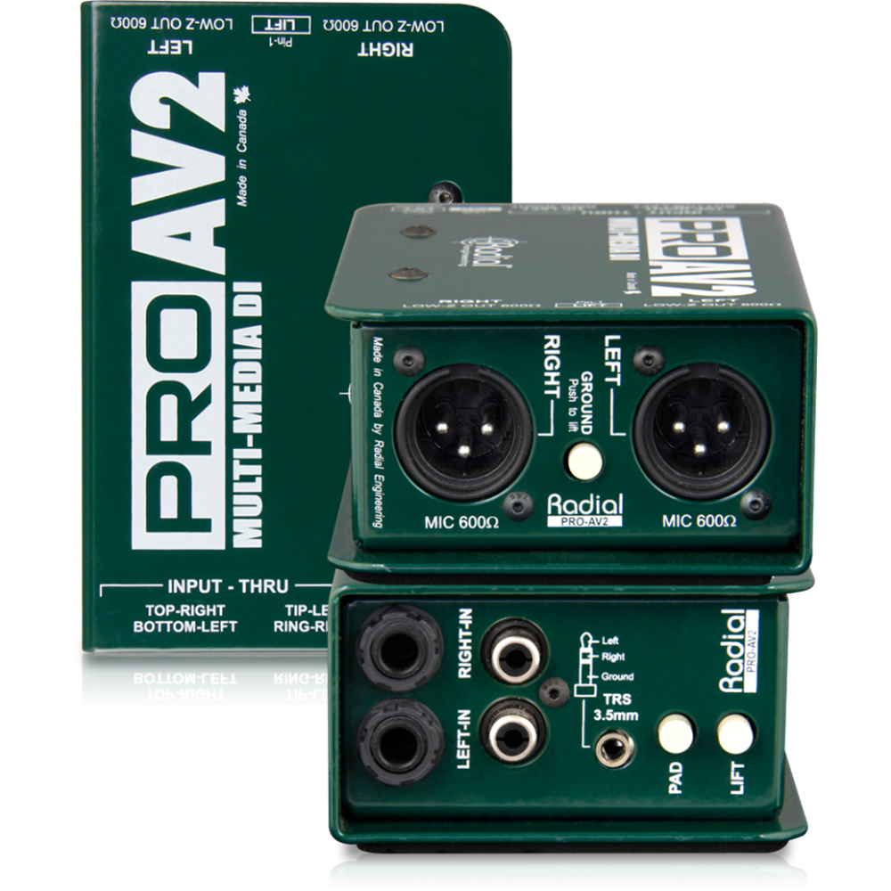The ProAV2 is an indispensable device for live sound engineers and audio-video technicians alike, with the ability to seamlessly interface nearly any device with a pro audio system. A 3.5mm stereo input jack and dual 1/4" and RCA connectors ensure that you won't ever be hunting around for adaptor cables, while ultra-quiet performance with transformer isolation helps eliminate hum and buzz from ground loops. The ProAV2 maintains stereo separation and exhibits linear frequency response from 20Hz to 20kHz, with balanced mic-level XLR outputs that allow you to send signals through a multichannel audio snake on stage or into two channels of a mixing console.