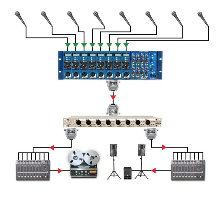 Recording live using high quality preamps delivers the best results. Connect your preamps to the LX8 and split the signal to the recorder and the PA using the isolation to eliminate hum & buzz caused by ground loops.