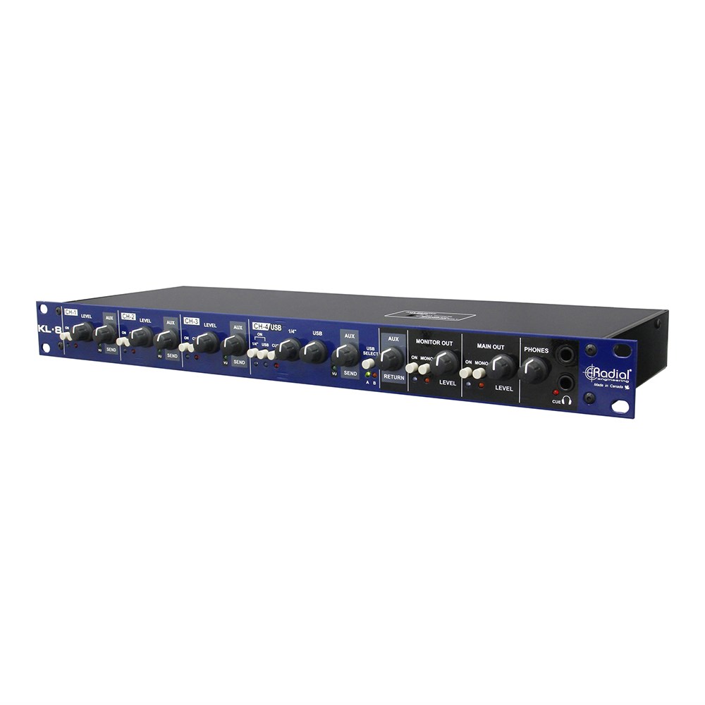 The KL-8 is a powerful mixing station created with keyboard pros in mind, with a number of features designed specifically to streamline and enhance any keyboard setup. You can connect up to four keyboards in mono or stereo, with level controls, aux sends, and LED indicators for each. A stereo aux send/receive is available to feed rackmount reverbs and delays and effects pedals, or it can be used as an additional input for a fifth keyboard. MIDI and USB connections make it easy to control a laptop soft-synth, utilizing high quality 24bit/192kHz digital audio converters. The KL-8 also features multiple output options, with transformer-isolated XLR main outputs to feed the PA, monitor outputs for a set of speakers on stage, and dual headphone outputs for local monitoring and testing.