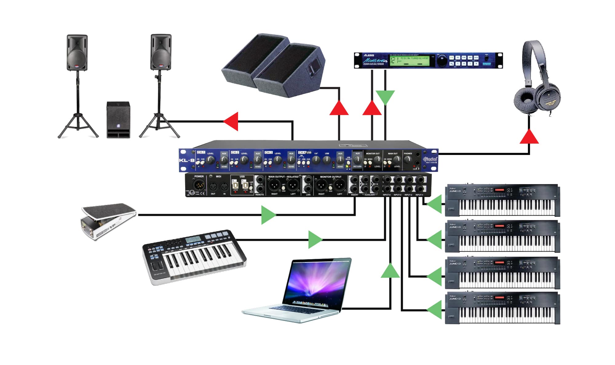 The KL-8 can take the MIDI output from a controller to play a soft-synth on your laptop. High quality digital-to-analog converters give you great sound quality on local monitors and at the PA system.