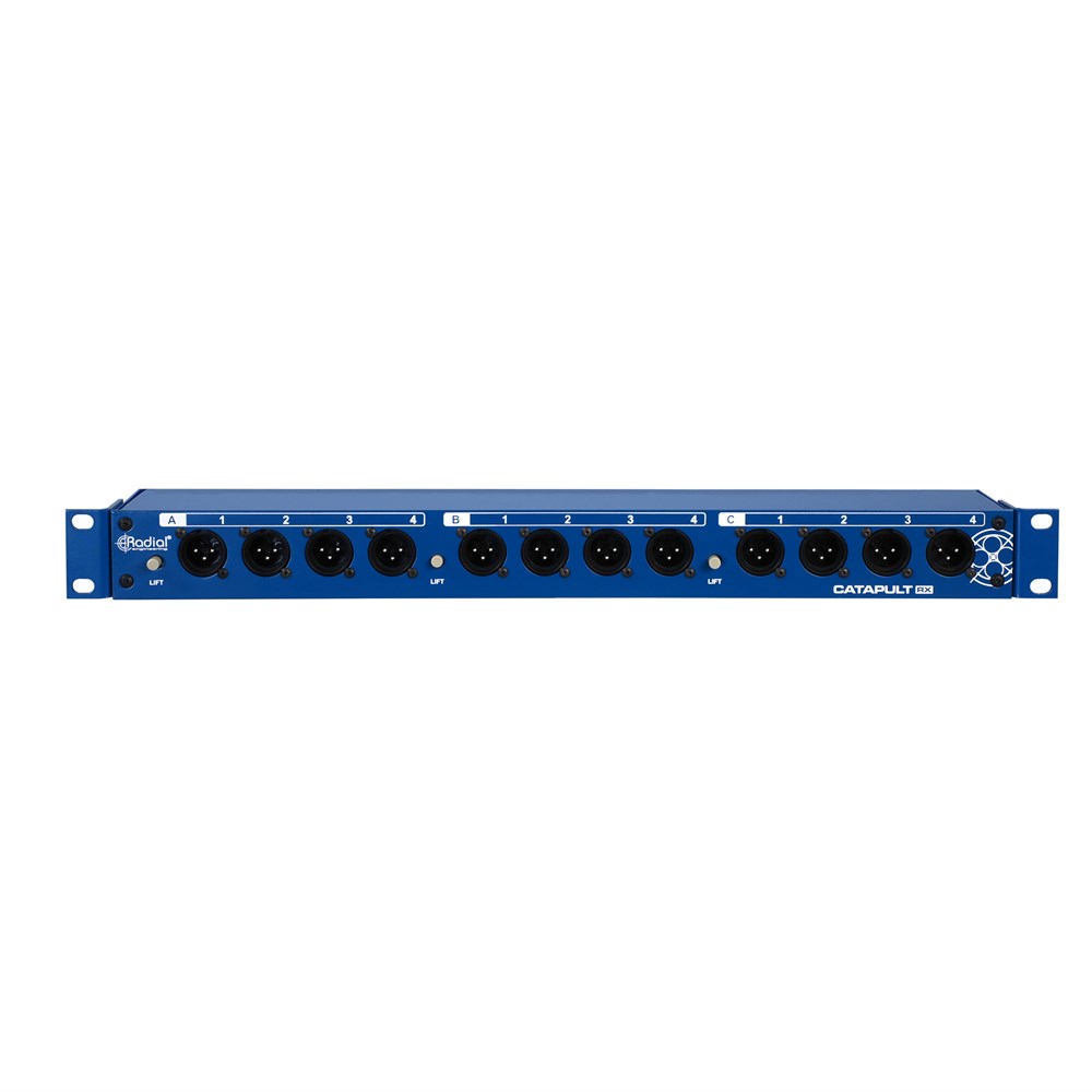 The Catapult Rack units operate like three modules in one chassis. Since each Cat 5 Ethernet cable can carry four channels, the 12 XLRs on each Catapult Rack are split into three banks, each with their own noise-eliminating ground lift switch and RJ45 Ethernet jacks on the rear panel. You can use three Ethernet cables to connect all 12 channels to a single location, or split them off to any of the Radial Catapult stage boxes, providing you with a fully customizable audio snake system that can connect multiple destinations at once and even include transformer isolation where needed.