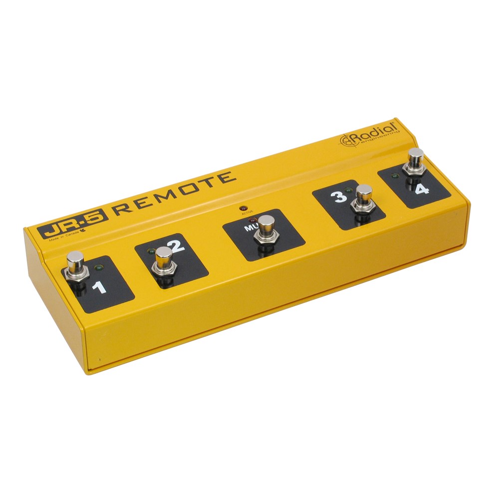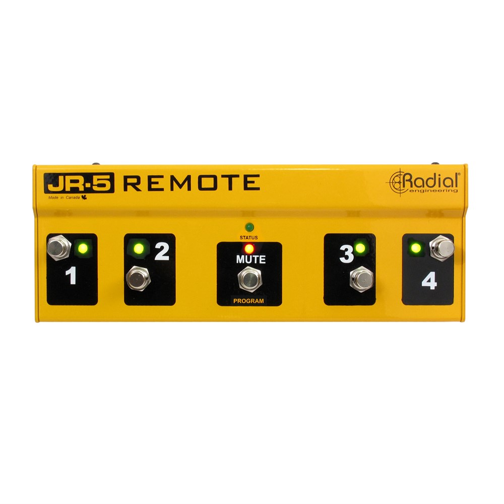 The Radial JR-5™ is a multi-switch remote control designed for the Radial JX44 Air Control wireless guitar and stage amp switcher. It features 5 footswitches that can be used to select instruments or amplifiers. Inside is a programmable memory chip (PIC programmable interrupt controller) that may be programmed using banks or used in manual mode. A series of five ¼” momentary contact closures may also be used to translate switch commands from a MIDI controller to remotely control the JR-5 and JX44.