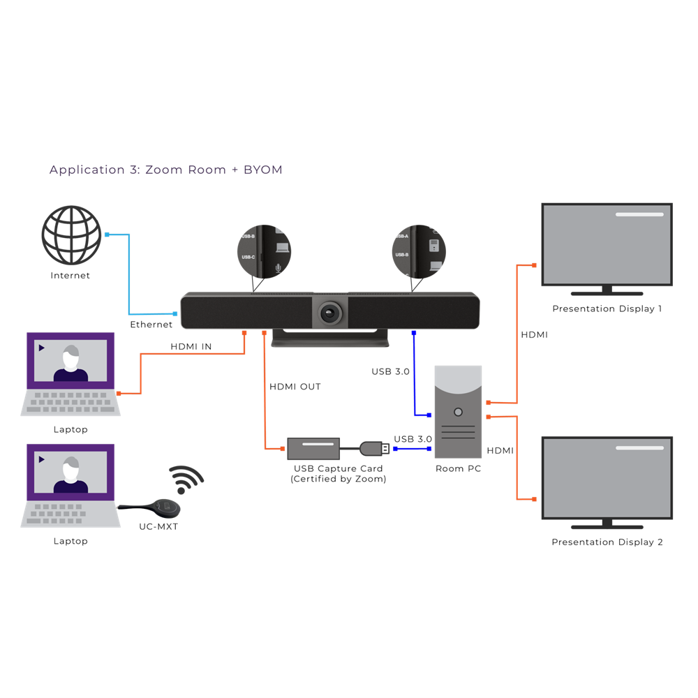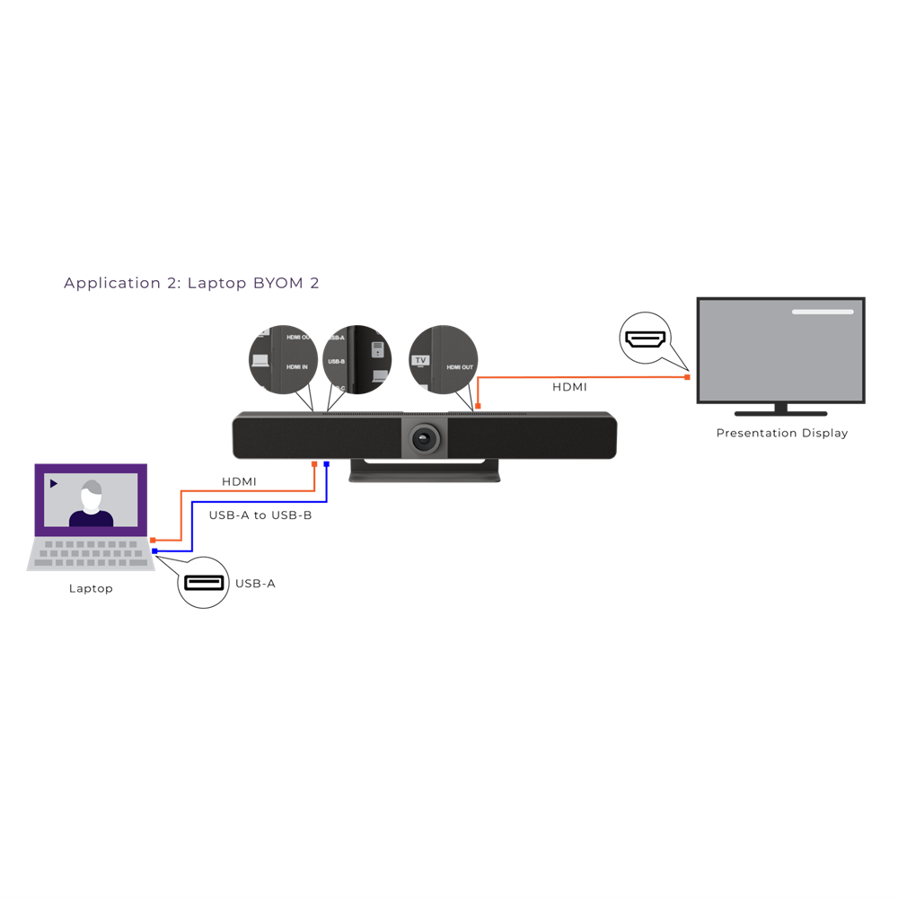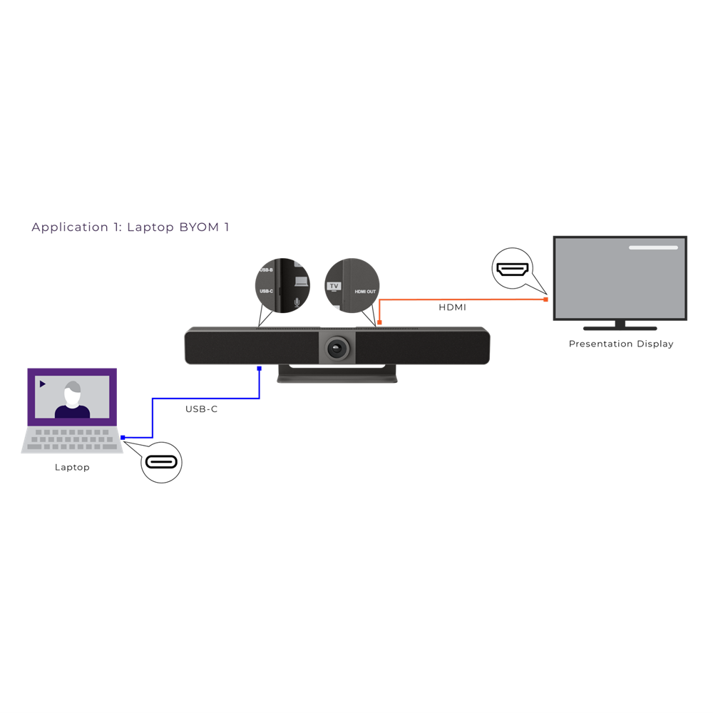 Wired BYOM ConnectivityConnect a local PC using HDMI and USB—or a single USB-C cable—for an easy BYOM (Bring Your Own Meeting) experience.