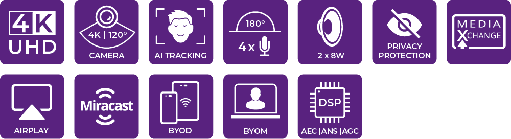 Elevate your meeting space with effortless wireless presentation, vivid 4K video, and crystal clear audio.