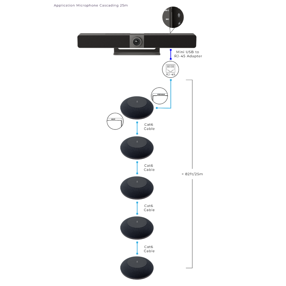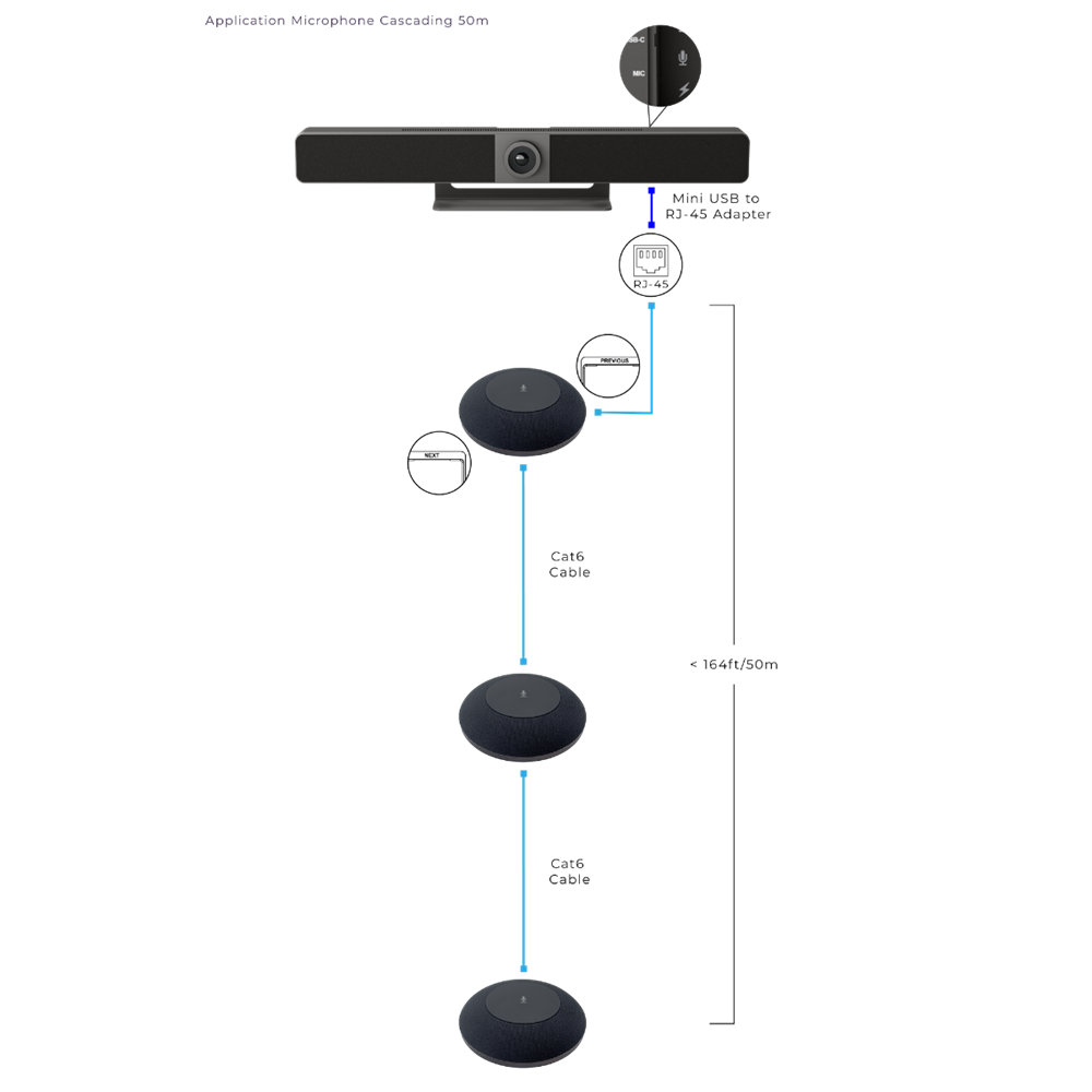 Additional RangeUp to 3 UC-IVB-EXM extension microphones can be daisy-chained together using CAT-6 cabling and a total cable distance of 50 meters. Up to 5 UC-IVB-EXM extension microphones can be daisy-chained together using CAT-6 cabling and a total cable distance of 25 meters.