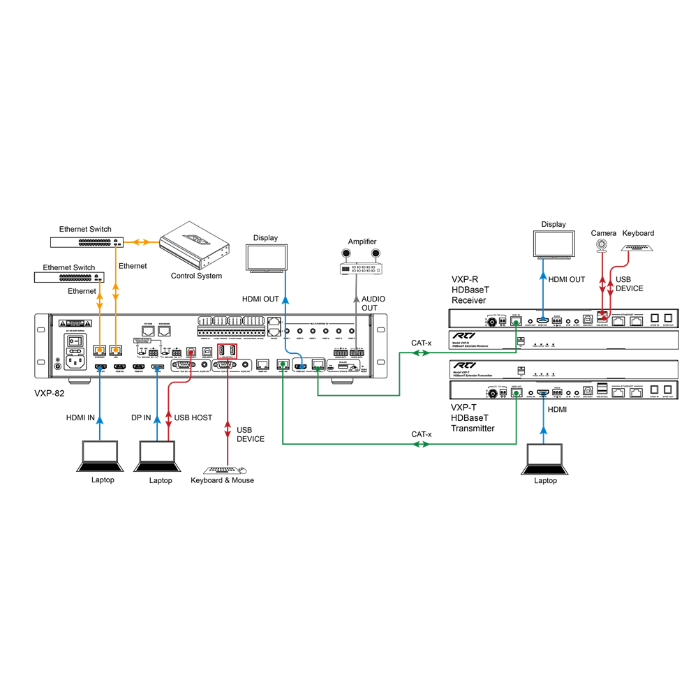 The VXP-R (receiver) is designed for use with the VXP-82 Presentation Switcher & Control Processor to extend high-resolution video, audio, Ethernet, control and KVM signals over long distances up to 492ft (150m) via a single Cat5e/Cat6 cable. In combination with the VXP-82 multiple video sources can be distributed to up to up to two displays.
