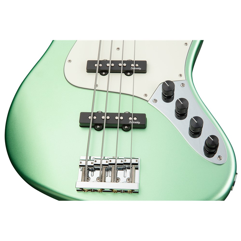 Roger Sadowsky's goal was always to further improve an already very successful bass design by making a number of detailed improvements. Along with the electronics, which he developed by himself, he succeeded to raise the well-known J/J bass sound to a new level, so today you can speak of a typical Sadowsky tone: Never harsh or shrill sounding, with strong, powerful but never muddy bass, with present, but not too aggressive mids, and a sweet and airy treble range. All features of this modern bass sound can also be found in the 21-Fret Vintage J/J basses of the MetroLine series made exclusively in Germany. All basses are lightweighted with approximately 8.4 pounds. A good choice for bass players who are looking for a lightweight solution for the stage in addition to a modern bass sound. Special features of the Vintage J/J basses of this series are the active electronics with true bypass, Vintage Tone Control, treble and bass boost, ultralight Hipshot tuners and the special Sadowsky bridge for quick string release. This 4-string bass in sleek undersized J-Style shaped red alder body comes in Solid Sage Green Metallic Satin finish.