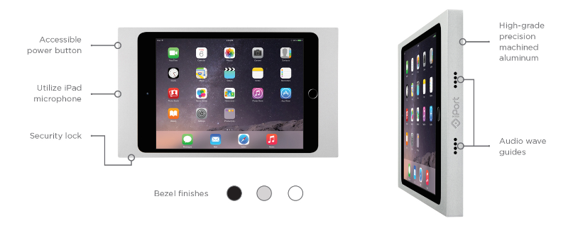 Surface Mount System for iPad mini 4 allows you to mount and charge iPad on nearly any surface. Choose a system that includes a Bezel & Splitter or one that includes Bezel, Splitter & Injector. Choose from 3 bezel finishes: Black, Silver and White.