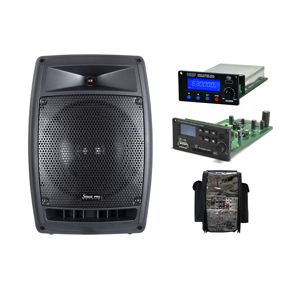 1x Stagepro 200W Portable PA with 8 inch 2 way speaker1 X SDR8200M-6 true diversity (650-675 Mhz) UHF receiver + w/bluetooth built in1x DPR-500M record/player w/ USB/SD + remote. 1x DC35 dustcover included