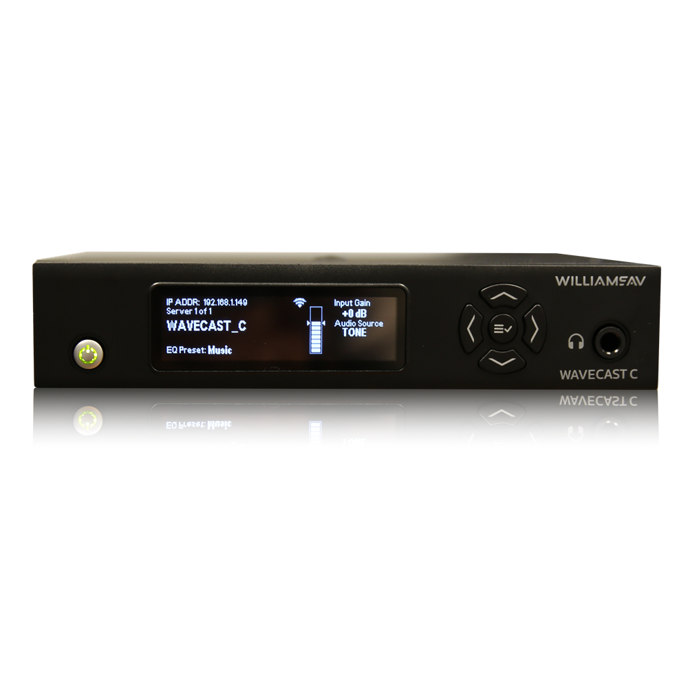WaveCAST C is a Wi-Fi audio platform designed for pro-audio applications where high-quality sound is required. The audio is streamed to an app on personal devices or a Wi-Fi receiver, which can be used for assistive listening and other purposes. WaveCAST C integrates with third-party room systems allowing AV professionals to control with Telnet commands via Ethernet.